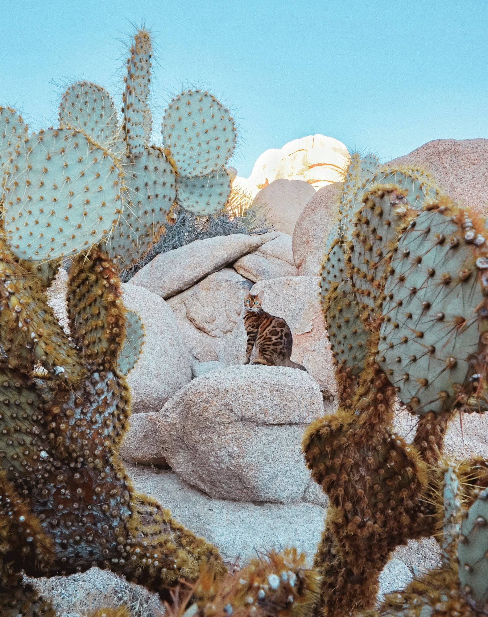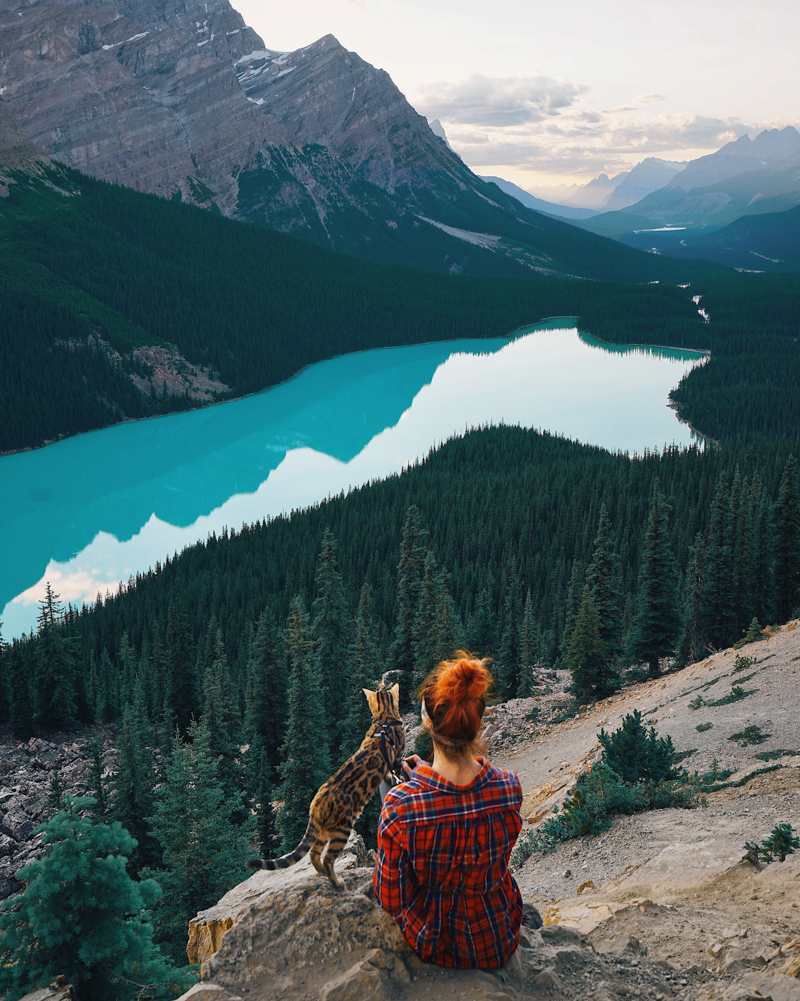 The photos on Suki’s Instagram account depict her confidence. Whether she’s perched on a canoe or overlooking a valley, Suki can strike a model-like pose almost anywhere. Gutfreund loves photographing her feline friend at the ethereal Lake Louise and Emerald Lake, both nestled in Canadian parks, but Suki herself has other preferences: desert settings.