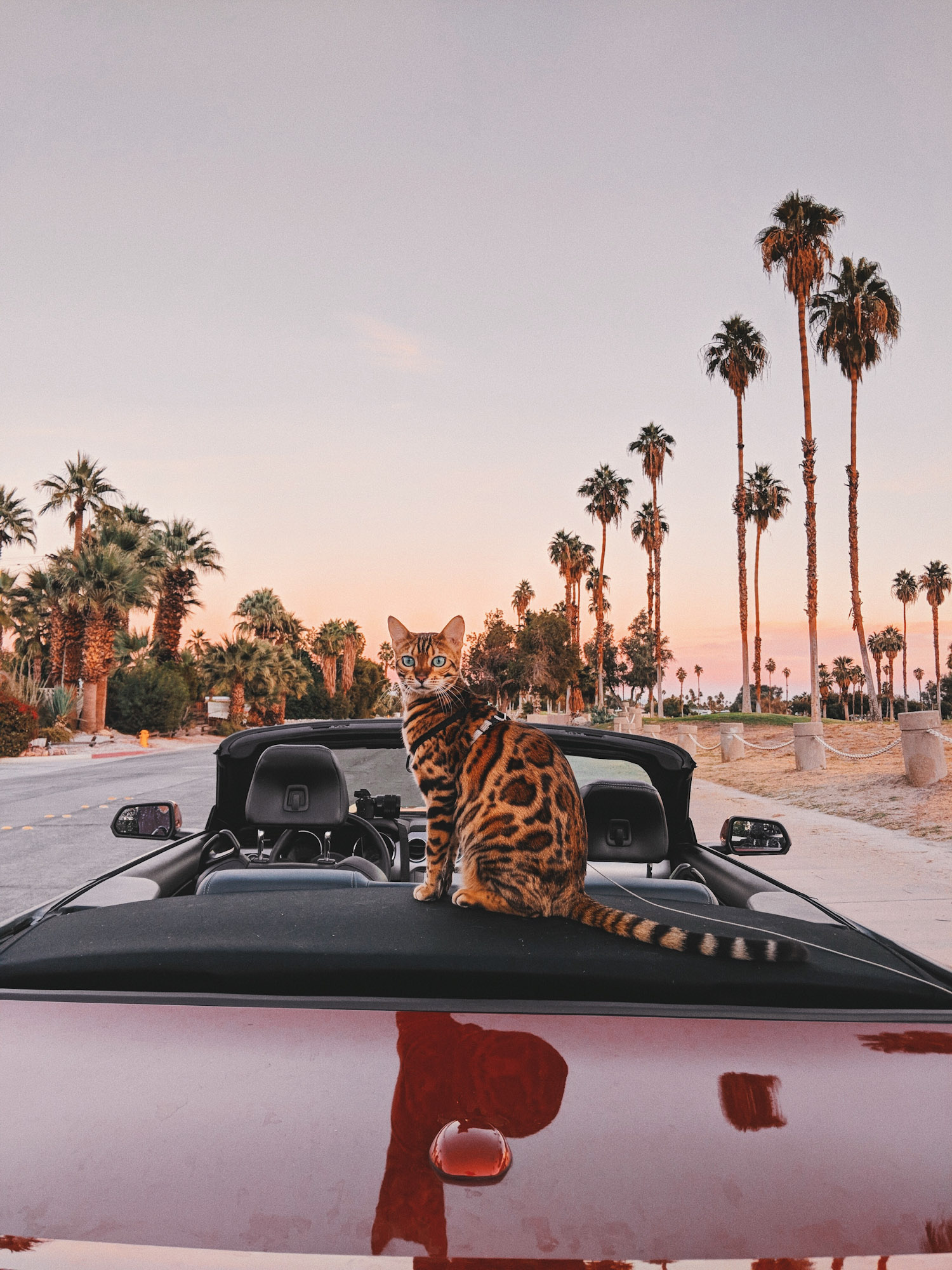 “She absolutely loves it there,” Gutfreund says. Suki has also traveled to the more glamorous desert city of Palm Springs, California, where Gutfreund captured a picture of her sitting atop a cherry-red convertible.
