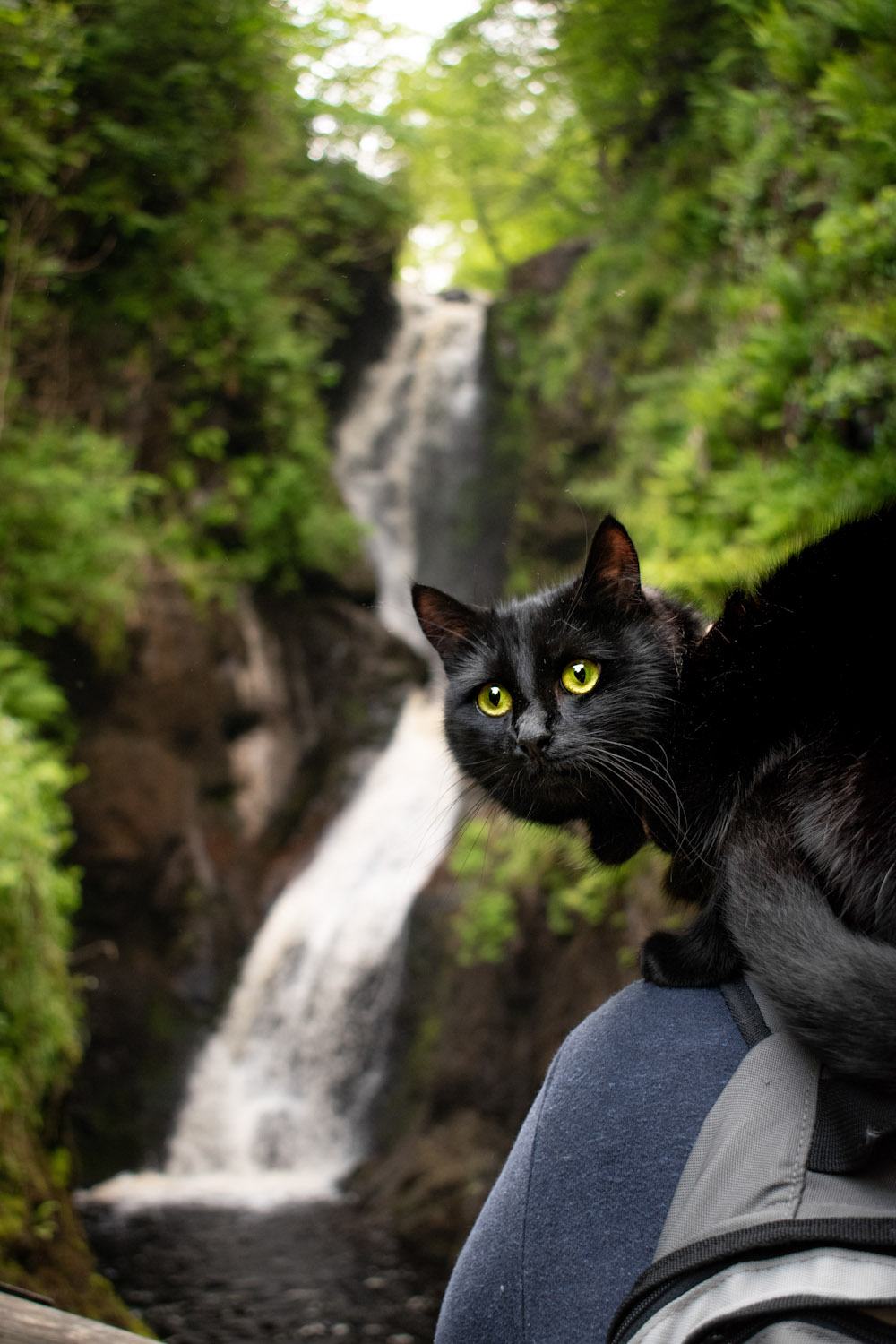 During her ventures, Mila alternates between traversing tails and enjoying the views from atop her humans’ shoulders.