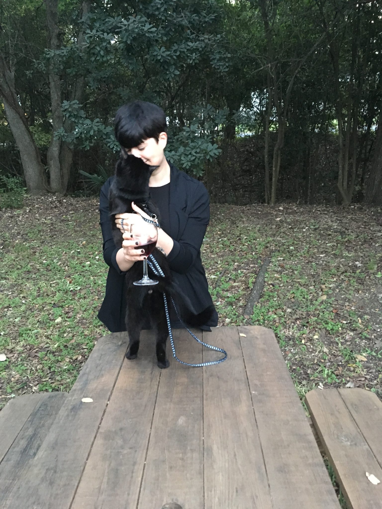 “Typically we just walk around the perimeter of our house,” Klacko says. “Figaro’s leash and harness hang by our back door and he waits by it every morning. He likes to sit on the picnic table with me and sniff grass and trees. If he’s feeling particularly energetic, we’ll jog around the house. His walks and leisure time outside are anywhere between 5 minutes and 45 minutes.”