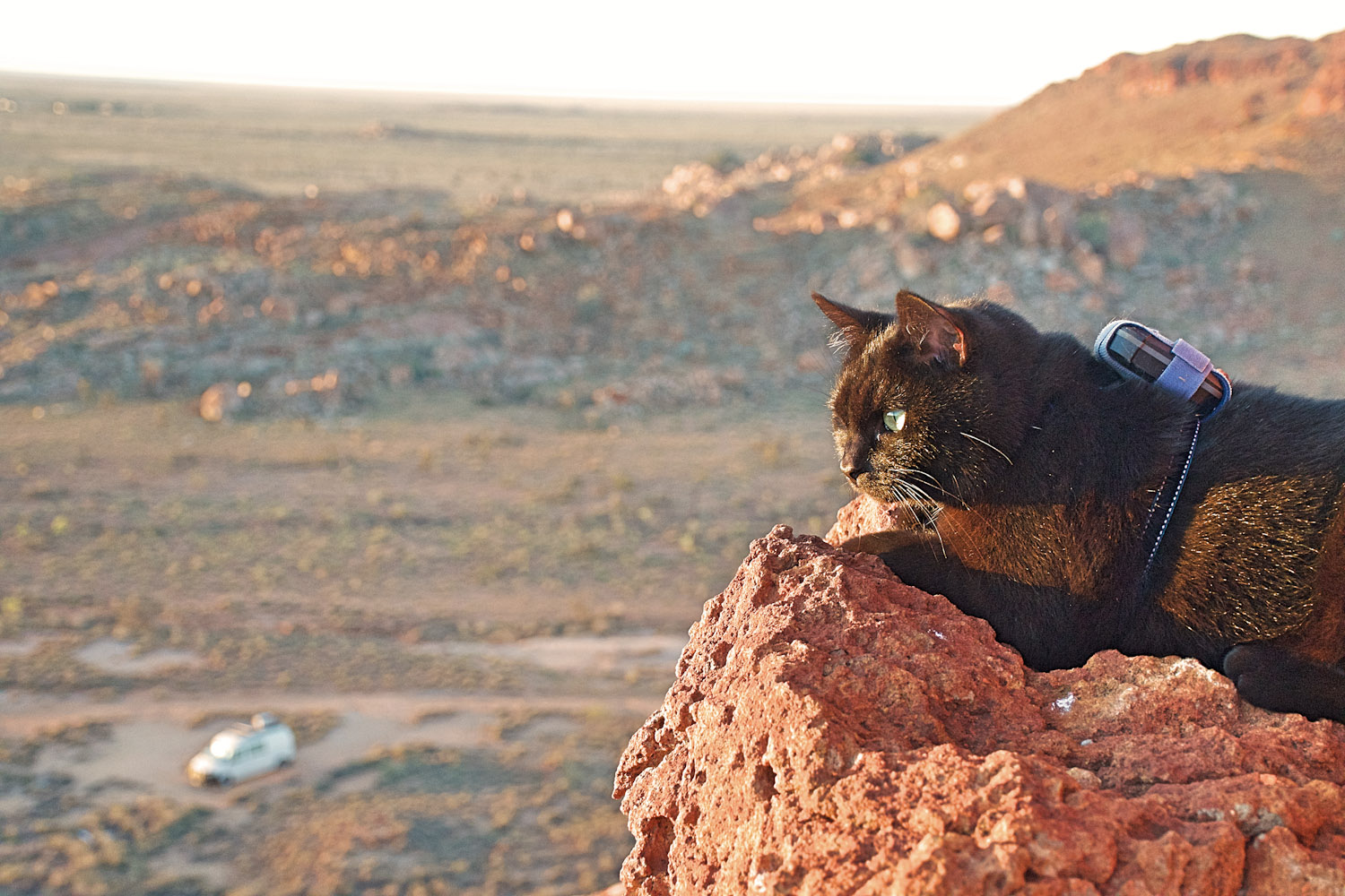 Traveling with Willow isn’t all naps and sunbathing though — there’s plenty of activity to be had. On one of their more memorable adventures, East and his kitty companion stopped at a stunning campsite along the Australian savanna with an incredible monolith rising from the flatness. They both crawled out to stretch their legs, looked at each other, and then in tandem started climbing toward the top. East slipped over rocks while adventurous Willow gracefully made her way to the top, stopping every few feet to impatiently wait for her companion.