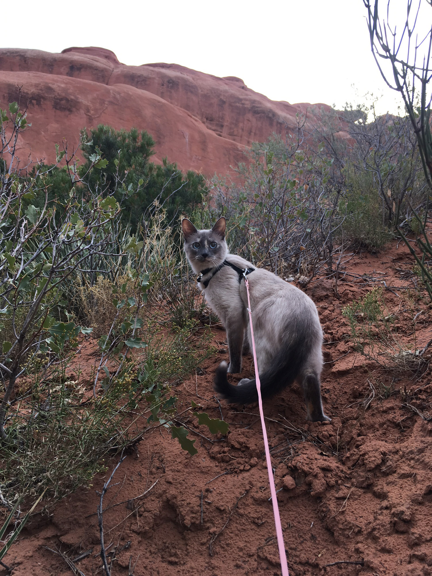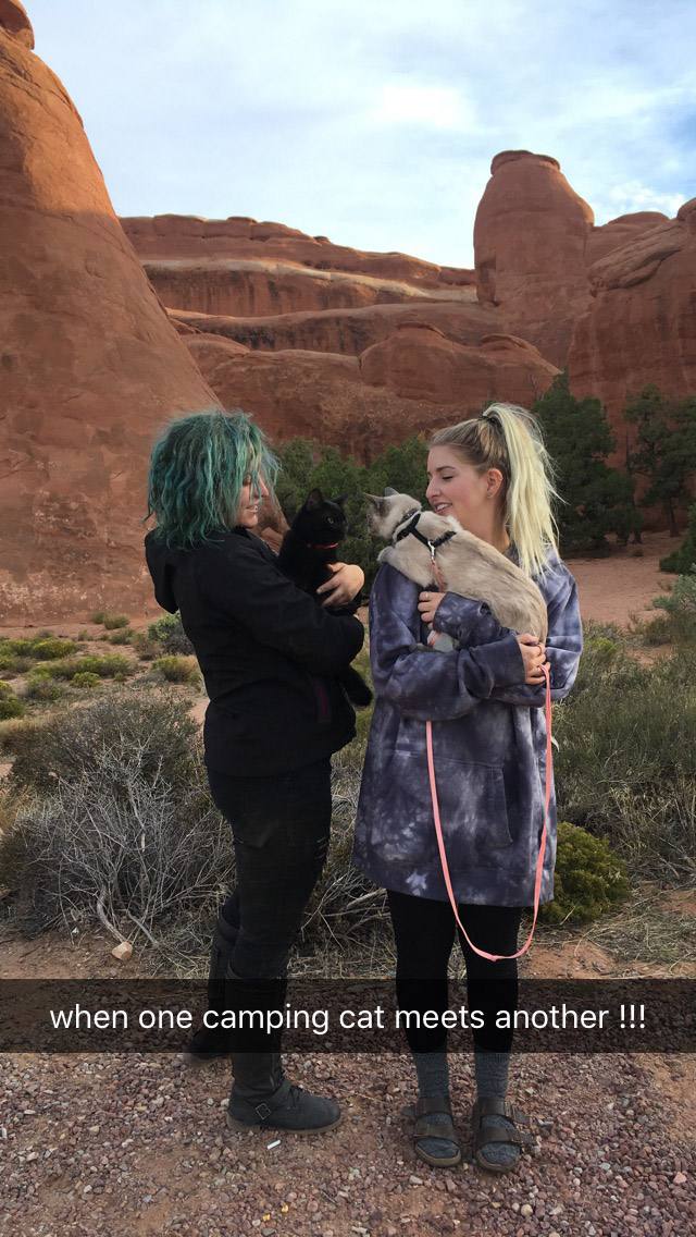 “We arrived at Devil’s Garden campground in Arches National Park around 8 p.m. and realized that the campground was closed, and so we stopped by another car of kids our age to try and make plans,” Hinkley said. “The kids ended up being from Canada, and they had a cat with them too! We decided it was fate. We had to all camp together with our camping kitties. It was amazing seeing how much fun Tuna was having playing in the red sand and climbing on the rocks and boulders.”