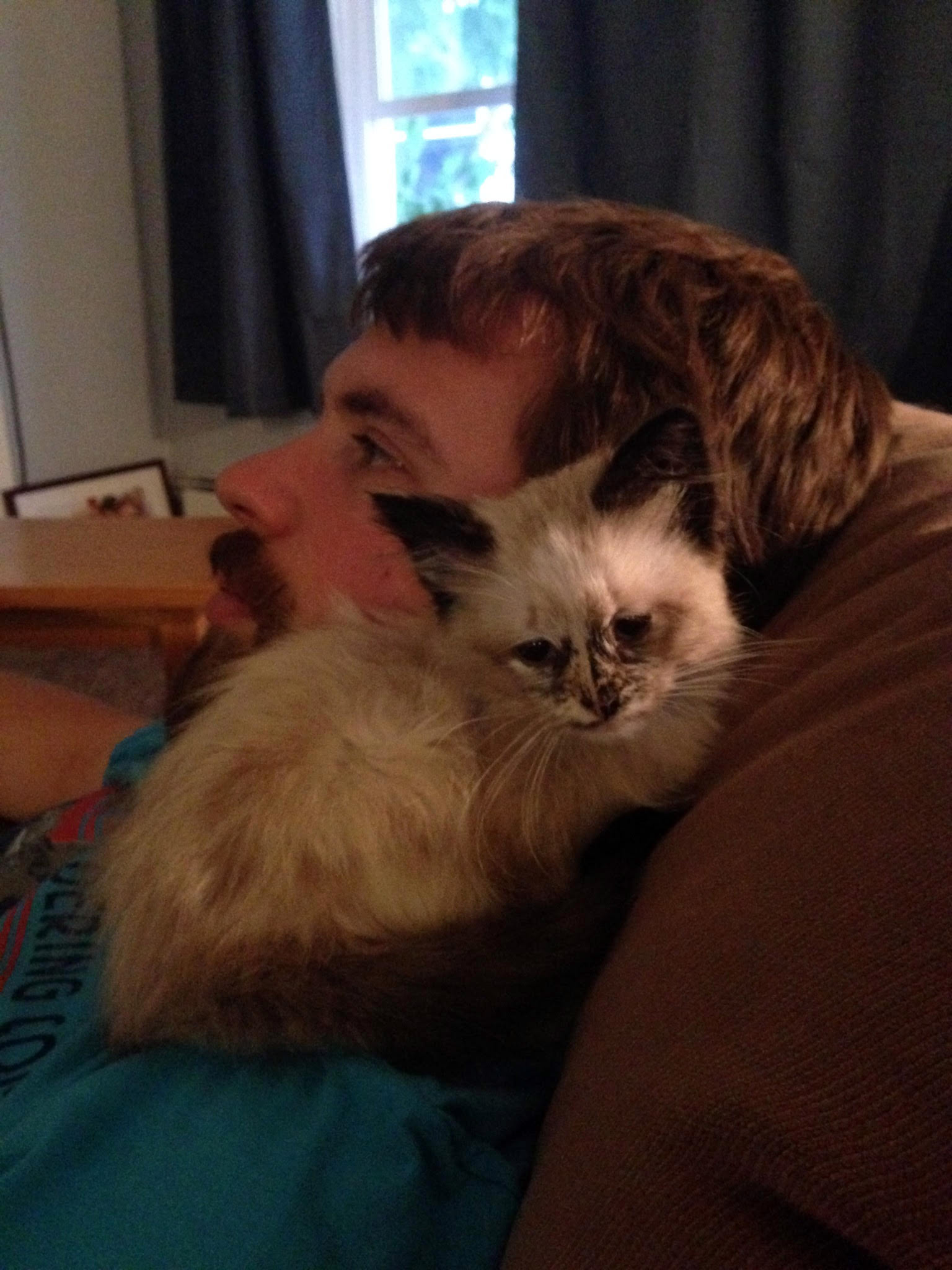Seven years previously I had found two kittens underneath my car and kept them. We have both always wanted a dog as well, but we just don’t have the space and the means for one. Instead, we decided to treat Zhiro as both a cat and a dog.