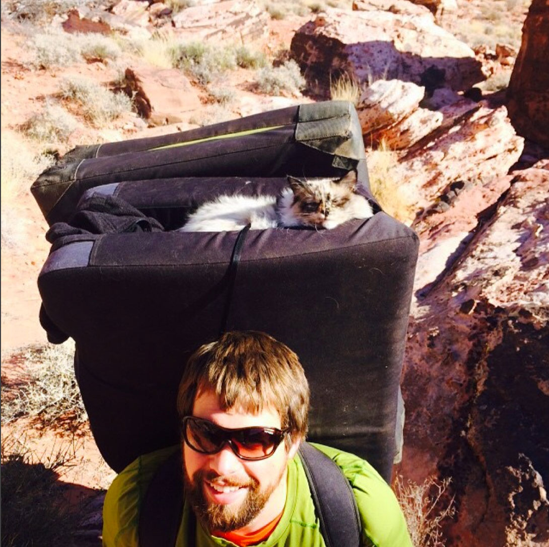 Zhiro accompanies us on climbing trips. She prefers to be carried on our crash pads while we hike to the climbs. She will occasionally walk on her own, but she does not like to stick to the trails.