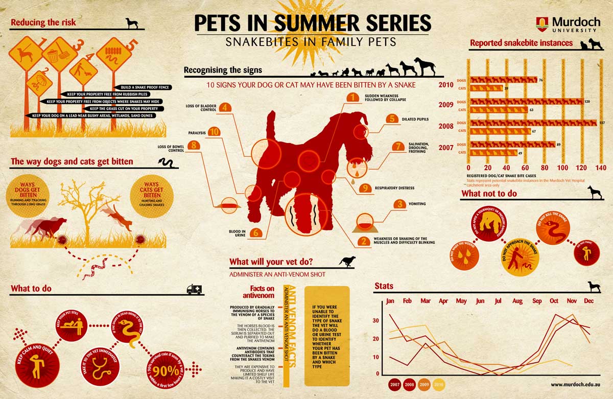 For more information on snake bites in pets, check out the infographic by Murdoch University below, but be aware that the data comes from Australia and may differ from your area.